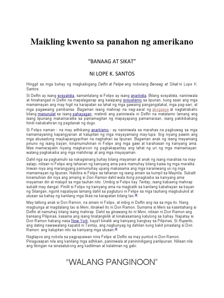 View Panahon-ng-amerikanodocx as PDF for free. Maikling kwento sa panahon ng amerikano BANAAG AT SIKAT NI LOPE K. Mga Pusong Sugatan na sinulat ni Guillermo A.