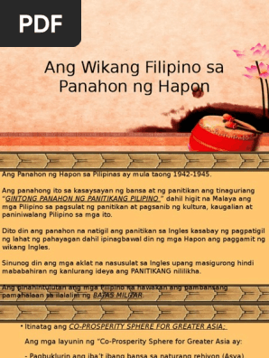 Kalagayan ng wikang pambansa sa panahon ng hapon. KasaysayanNgWikangPambansaPanahonNgMgaKatutubo PanahonNgKastila PanahonNgRebolusyongPilipinoWIKANGPAMBANSAMaraming salamat sa panonood. Hindi maaaring magkaroon ng karapatang-sipi sa anomang akda ang Pamahalaan ng Pilipinas. 20092018 Ang pagpapabuti ng edukasyon at moral na rehenerasyon at pagpapalakas at pagpapaunlad ng kabuhayan sa pamamatnubay ng Imperyong Hapones.