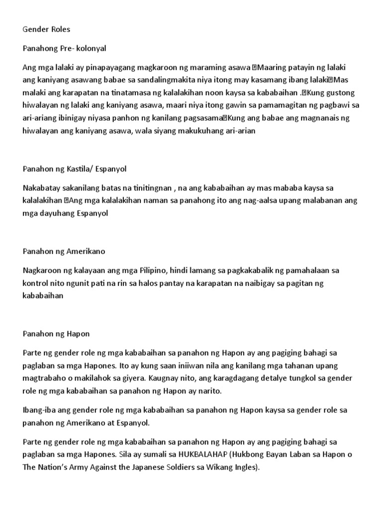 Ang mga babae ay naging asawa lamang sa tahanan at ang mga lalaki ay nag trabaho sa mga espanyolRead More. Panahong Pre-kolonyal Panahon ng Espanyol Panahon ng Amerikano Panahon ng Hapones Panahong Kasalukuyan. Dahil sa pagpapatupad ng pampublikong paaralan nagkaroon ng pagpapahalaga sa kababaihan sa panahon ng Amerikano hindi tulad ng Gender roles sa.