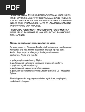 Grande sito di social reading e publishing al mondo. Nasa wikang InglesUmunlad ang sistema ng Edukasyon sa panahon ng HaponSir KirbyAng mga pagbabago noong Panahon ng haponEPEKTO NG MGA ITOGintong Panahon ng Panitikang PilipinoUmunlad ang paggamit ng Katutubong Wika TAGALOG Nagkaroon ng pag-unlad sa Panitikang Filipino at ibinukas ito. PANAHON NG HAPONES GRADE V.