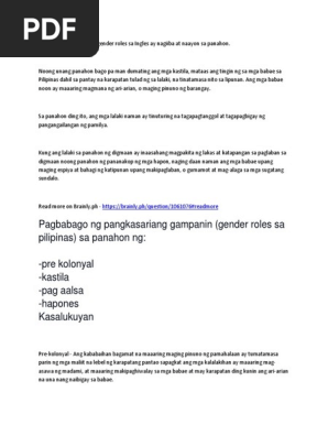 Sa panahon ng mga Amerikano maraming kababaihan ang nakapag-aral dahilan upang mabuksan ang kanilang isipan na hindi lamang bahay at. Mababang uri dahil hindi sila edukado. 3 question Ano ang gampanin ng babae at lalaki sa panahong prekolonyal - e-edukasyonph.