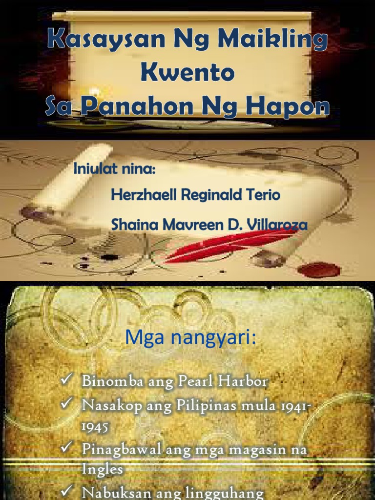 29062013 Kasaysayan ng maikling kwento sa panahon ng hapon 1. Karamihan sa mga ito ay pasalin-labi lamang o kuwento ng bayan. Rosario Cruz tinaguriang Ama ng Maikling Kwentong Tagalog PANAHON NG HAPON.